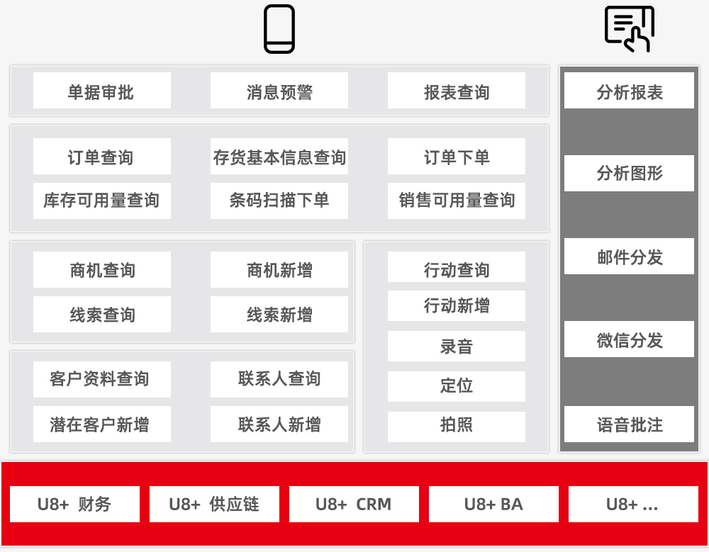 U8+支持企业实现商业软件的多端(PC、手机、平板等多种设备)多系统(windows、iOS、Android等主流系统)应用部署,实现跨屏应用,结合多种业务协作场景与业务处理流程,发挥移动设备便携特性及互联网广域优势,全面提升企业对最前端客户的消费行为、销售经理及团队的营销行为和营销通路的商业数据采集效率、关键营销业务的审批与处理效率,对提升企业整体市场竞争力,快速洞察市场变化,提升市场响应速度有巨大帮助。