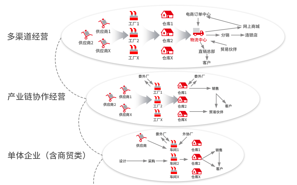 支持各类企业全生命周期的经营与管理,包括单体(含多工厂)产业链协作经营,多渠道经营的工业及商贸企业。