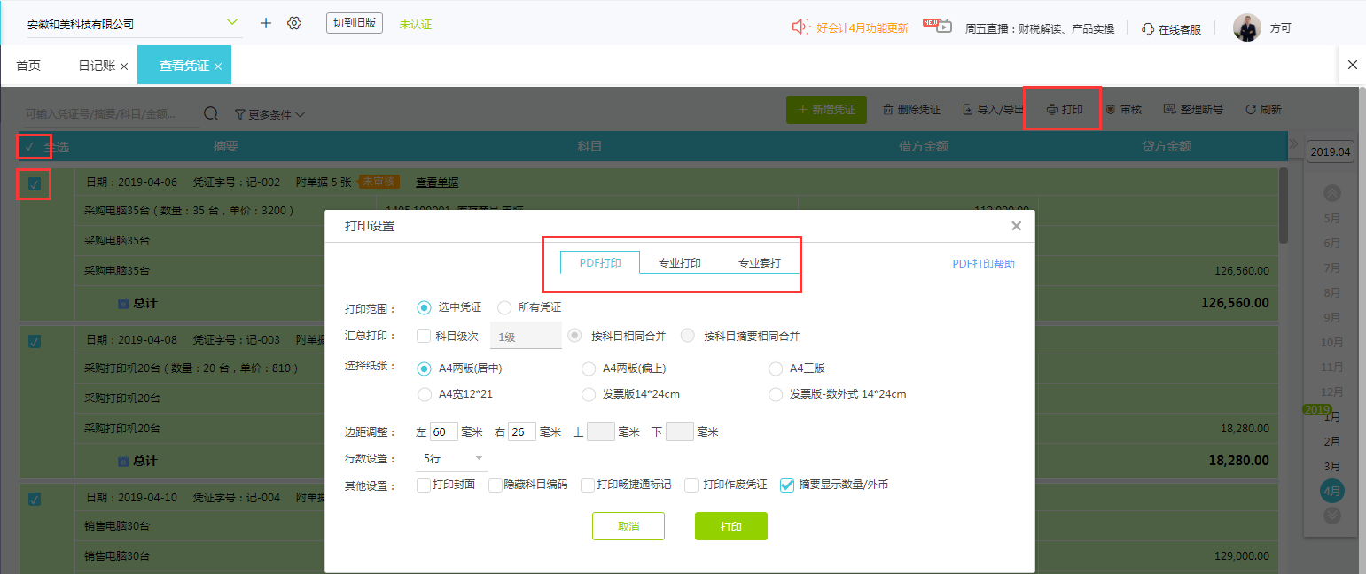 注:1、PDF打印:一般会把凭证内容全部印在A4纸张上。