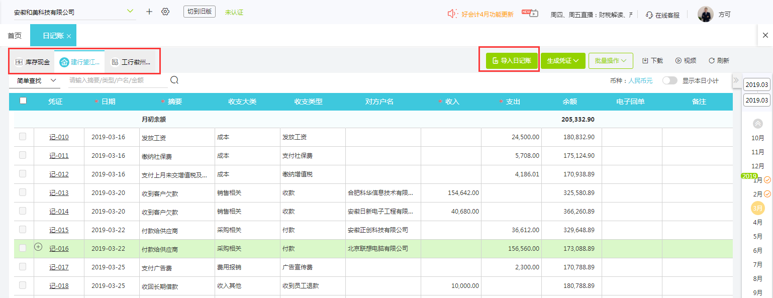 打开【资金管理】-【日记账】的界面,点击右上角【导入日记账】按钮;在弹出的【导入日记账】界面,选择需要导入的账户,选择文件点击【继续】,字体自动匹配字段,然后【导入】;软件支持各个银行下载的对账单直接导入,如果没有银行对账单,可以点击【下载对账单模板】或者自己编辑xls导入的话,可以在【日记账】界面,录入一条记录,然后点击右上角【下载】按钮,将下载下来的xls作为模板导入,然后补充完整导入即可。