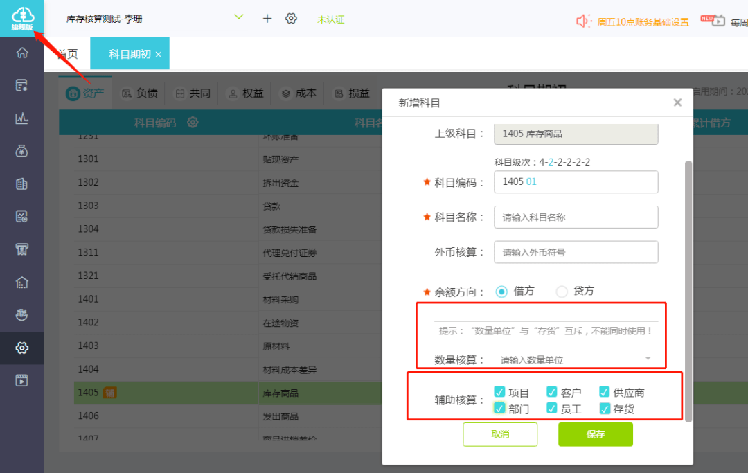 旗舰版支持多辅助核算(可以选择多个辅助核算项目在其后打钩, 需注意:数量单位”与“存货”互斥,不能同时使用!)