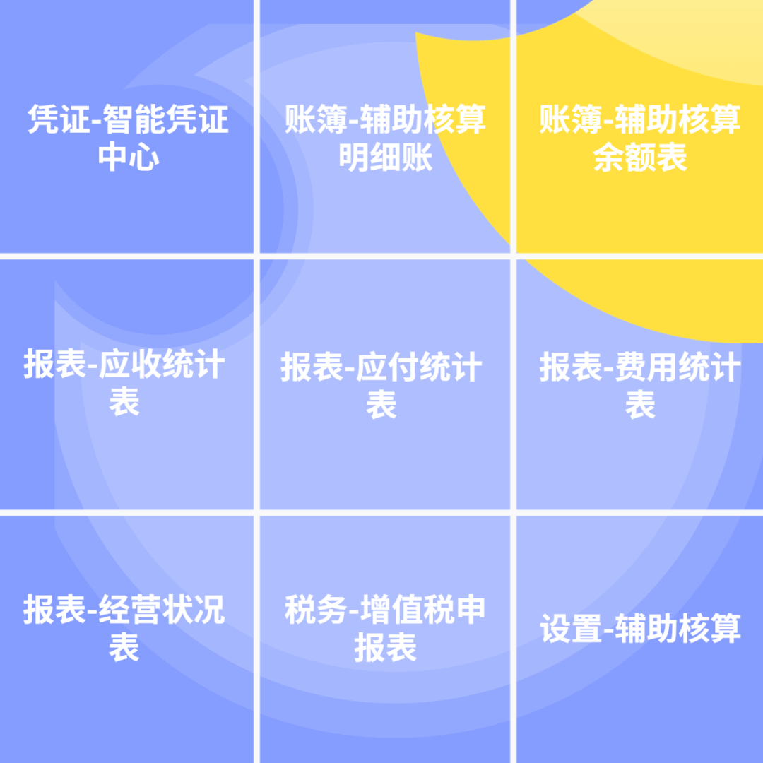 即:凭证-智能凭证中心、账簿-辅助核算明细账、账簿-辅助核算余额表、报表-应收统计表、报表-应付统计表、报表-费用统计表、报表-经营状况表、税务-增值税申报表、设置-辅助核算 9个小节点。