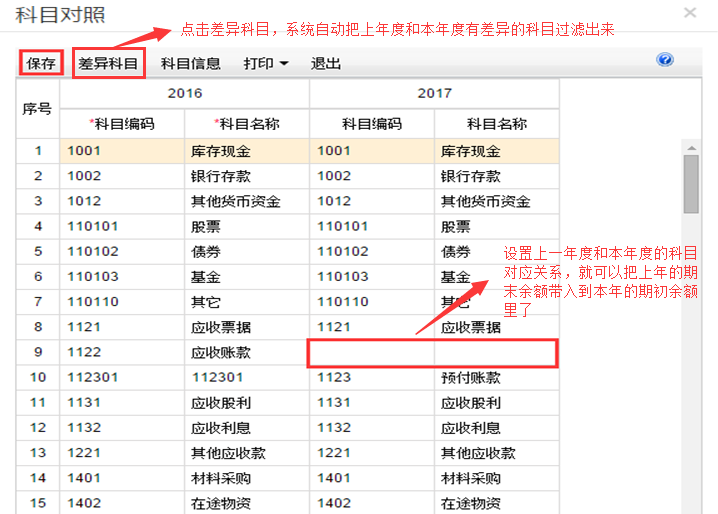 二、解决方法:所以,对于上面第一个问题,可以抓住第(3)点,如果应收账款在2017年度增加了辅助核算, 那么只要将应收账款的对照科目去掉就可以了,就可以结账了,然后手工的在2017年录入应收账款的期初余额即可。第二问题的解决方法是,把2016年新增的明细科目在2017年账套里再完全一样的增加一下,再到2017年的科目对照表里手动的确定两个年度的科目对照关系,最后到2016年取消12月份结账,再重新结2016年12月份账,这样的话,就会把2016年全部的期末余额带入到2017年的期初余额里了。