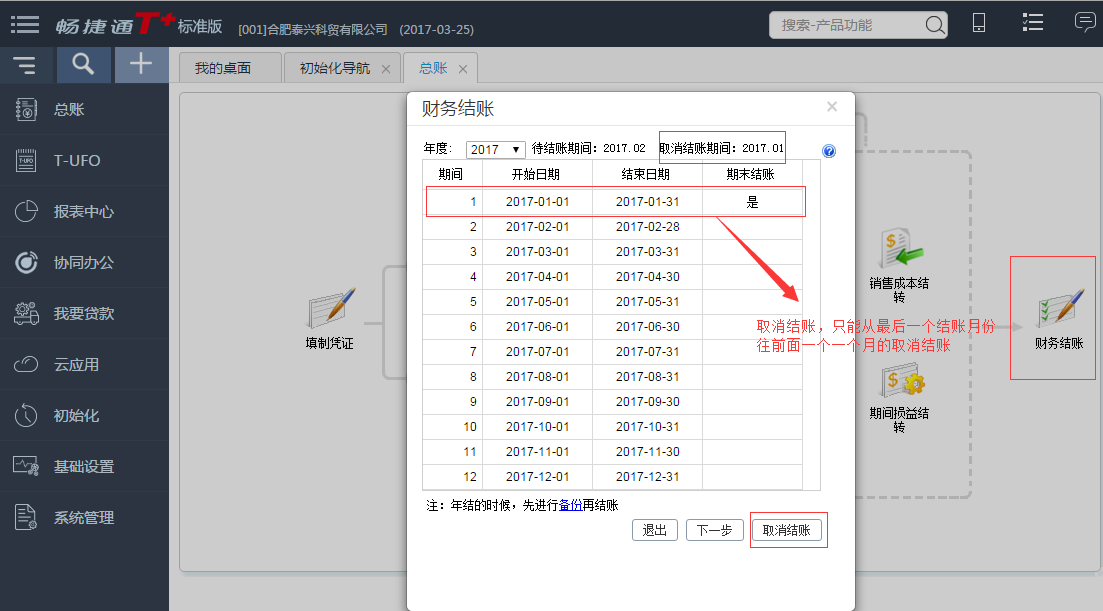 当T+总账系统结账之后,若发现已结账的月份中存在错误,需要修改的,需点击【取消结账】即可。