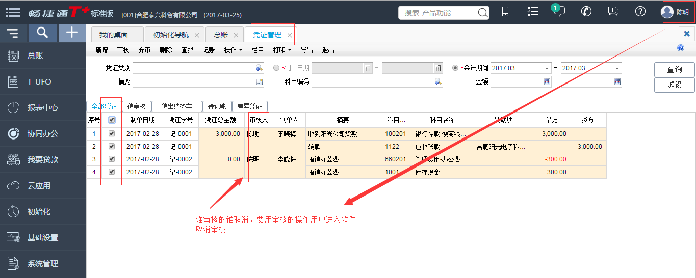 取消凭证记账之后,在修改凭证之前,还需要取消凭证审核(注意:谁审核谁取消)。用当初审核人的身份进入软件,进入凭证管理,选择需要取消审核的凭证,点【弃审】即可。