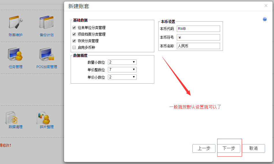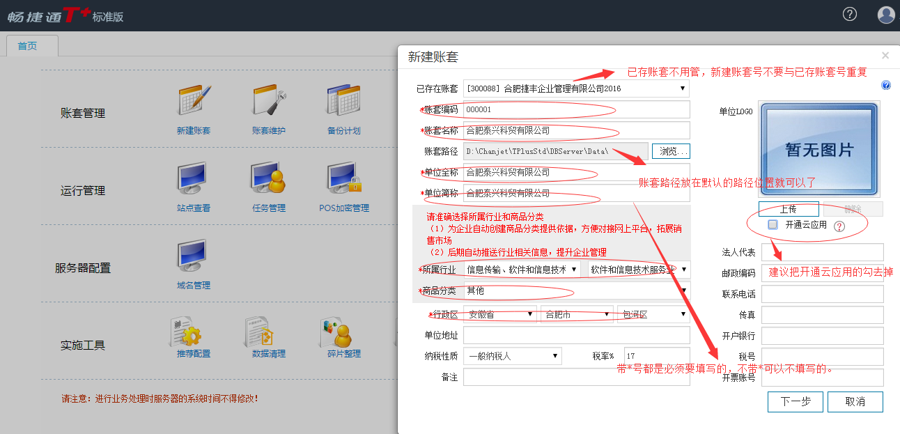2、进入系统管理后台后,点新建账套,录入账套编号、账套名称、公司名称等相关内容后,建议把“开通云应用”的勾取消掉,然后点击下一步。