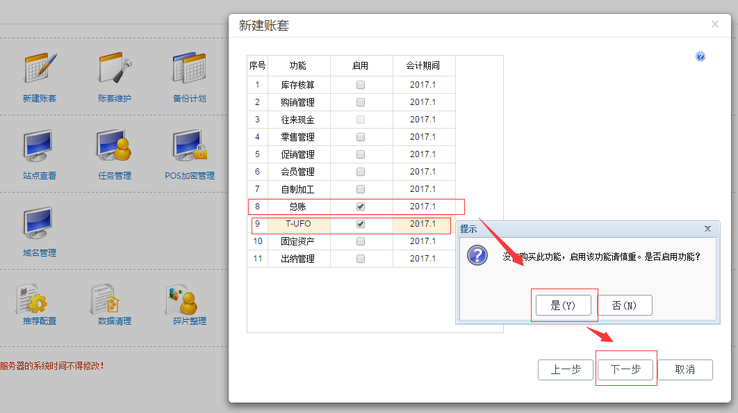 4、 选择要启用的模块,启用时注意启用的年月,点击是,点击下一步。