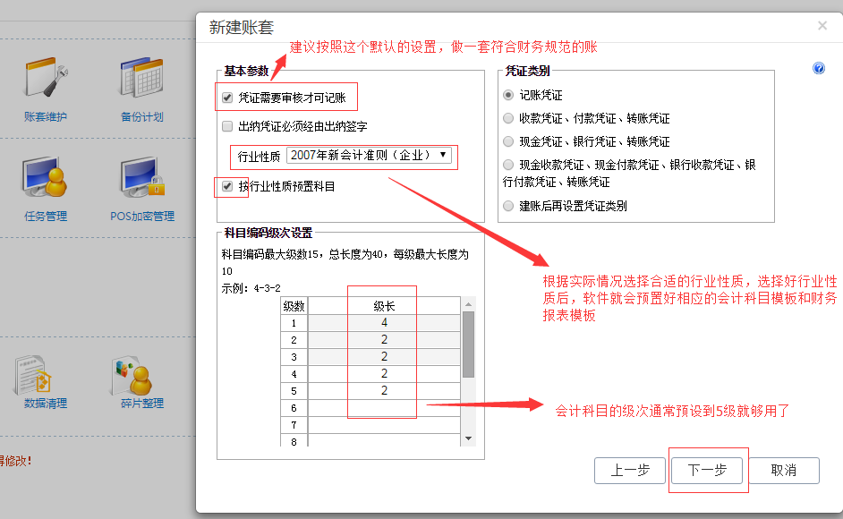6、选择该账套的行业性质,设置凭证类别,设置会计科目的编码级数及每一级的位长,一级科目的位长已经预置好了,是4位,如库存现金是1001、银行存款是1002;明细科目根据实际需要设置级数和位长,通常设到5级就够了,明细科目的位长通常设成2位,即4-2-2-2-2。点击下一步。