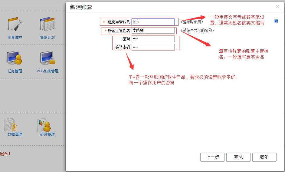 7、为该账套建立一个账套主管账号、账套主管姓名,并要求必须设置账套中每一个操作用户的密码。点击完成,然后等待,软件会生成新建账套的数据。