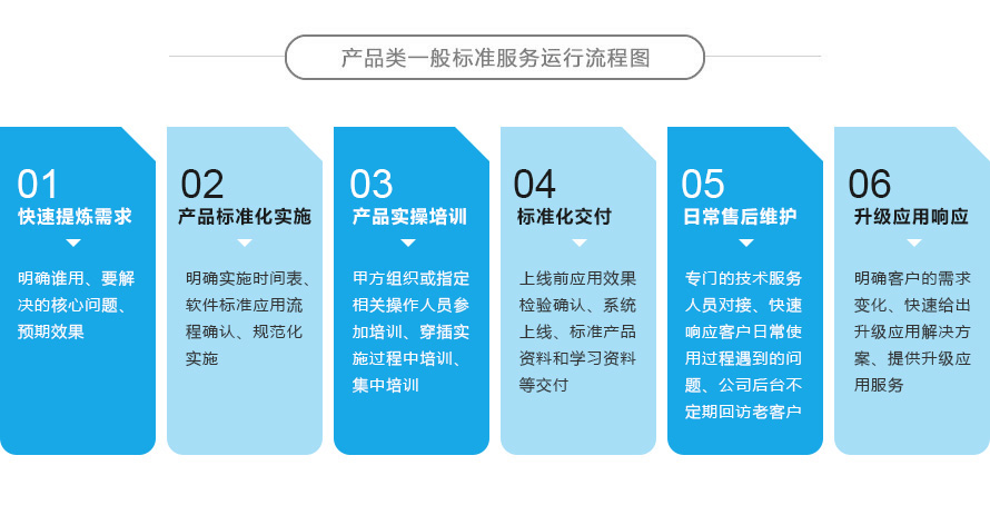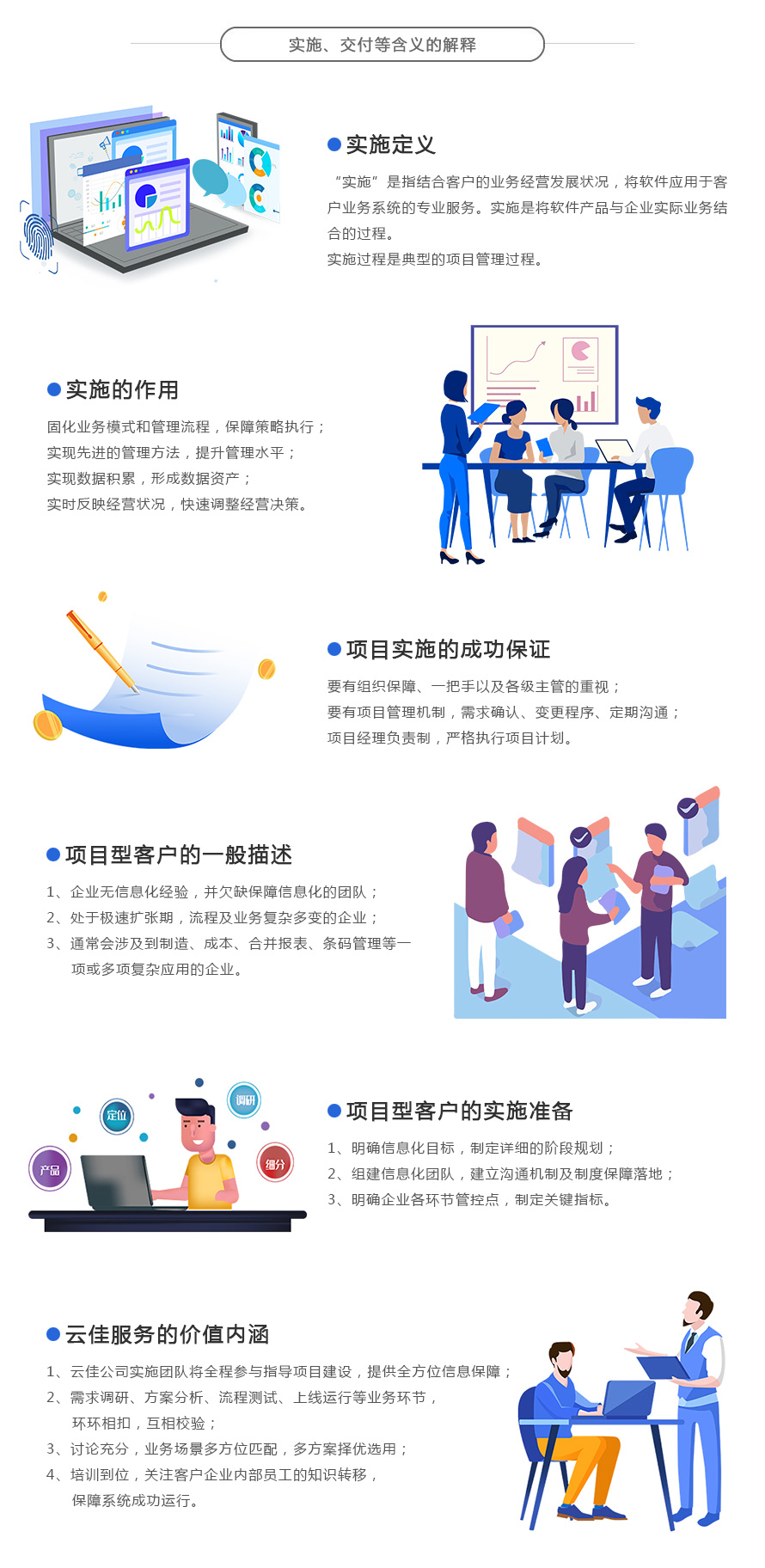 云佳公司目前约70%已合作客户的需求其实都是基于产品的标准化应用,基于对数以千计的已合作客户提供技术服务业务的经验总结,云佳公司摸索出一套基于产品标准化应用的一般标准服务运行体系,从把控客户实际需求、实施、培训、交付、日常售后维护、客户升级应用等技术服务业务环节为公司已合作客户提供一整套标准化服务,帮助此类客户快速上手使用我司提供的软件产品,并充分发挥出软件的应用功能和价值亮点,达到最佳的企业信息化应用效果!