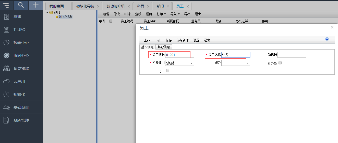 3.设置人员档案:点基础设置——>常用信息设置——>员工。对于某些科目要设置了个人辅助核算等情况,需要增加相应的人员档案。若想统计一些人员的出生日、学历、电话,可以“其它信息”中录入。