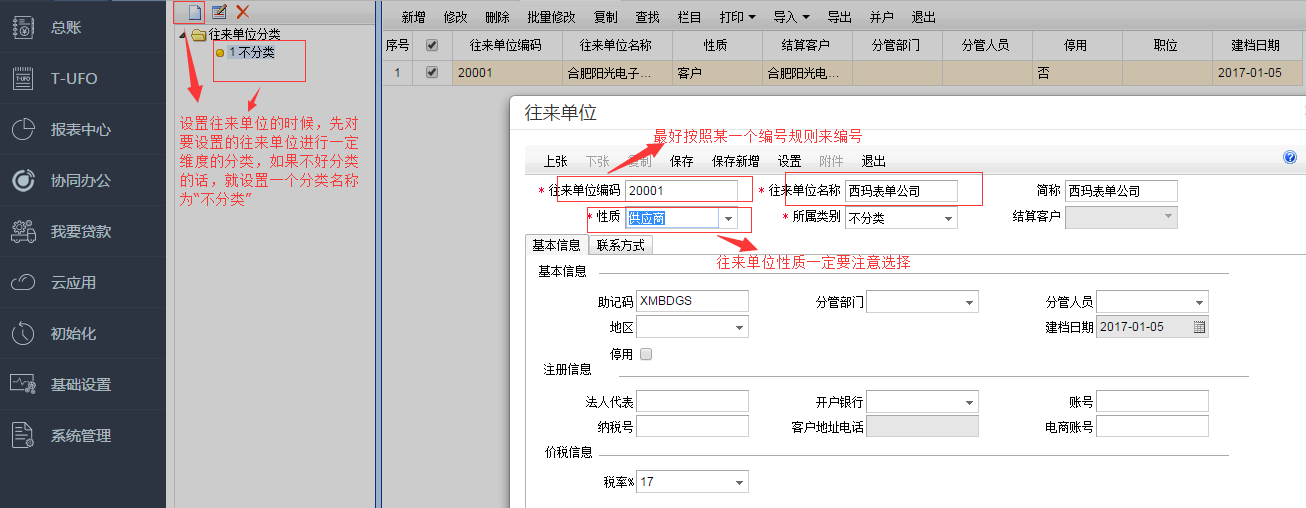 4.设置往来单位:点基础设置——>常用信息设置——>往来单位。对于某些科目(如应收票据、应收账款、预收账款、应付票据、应付账款、预付账款等)要设置了往来单位核算等情况,需要增加相应的往来单位档案。