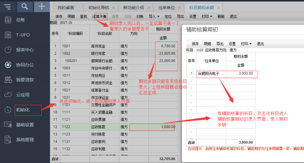 点系统管理——>初始化——>科目期初余额,对应科目直接录入金额,待录入完成之后,保存,试算一下,平衡即可。